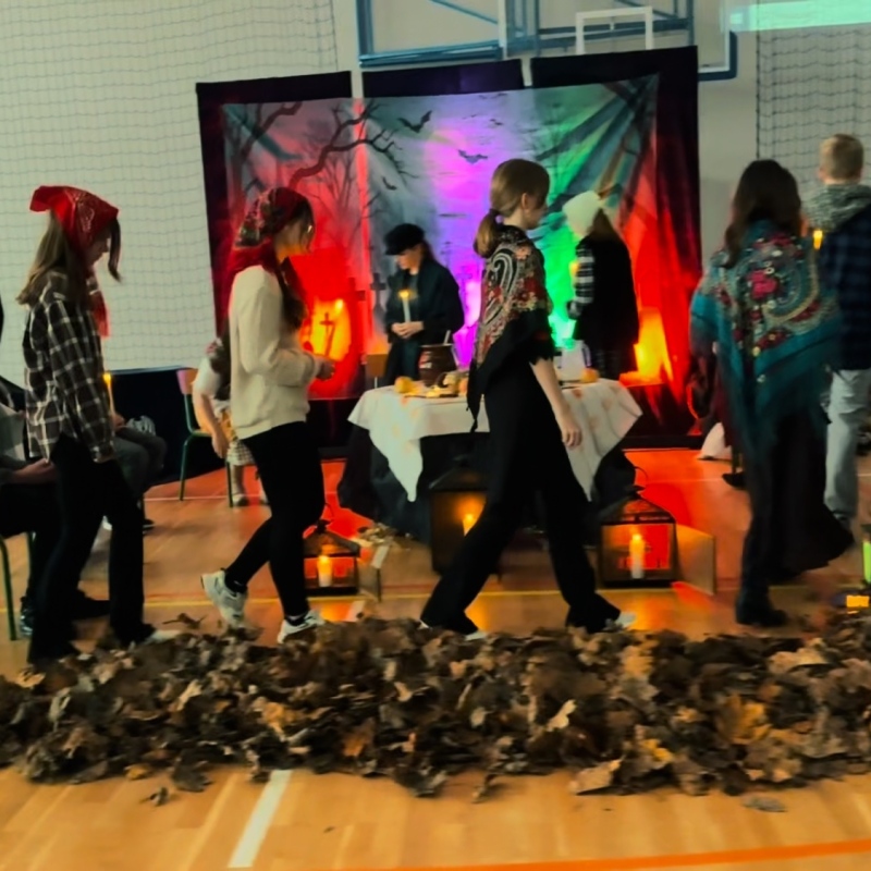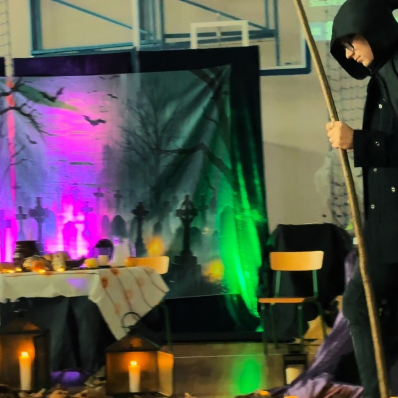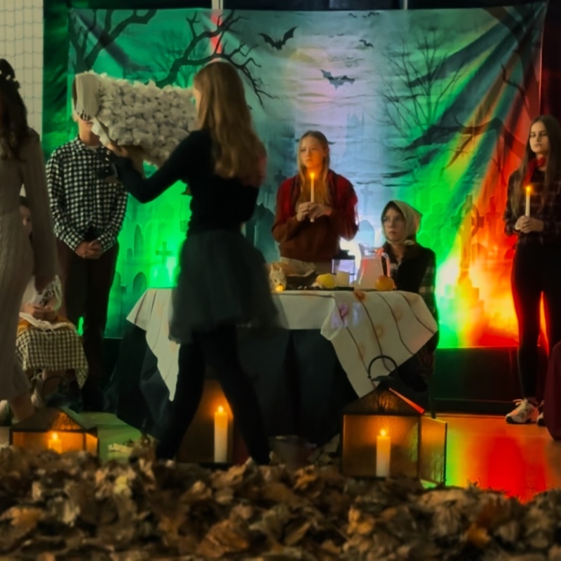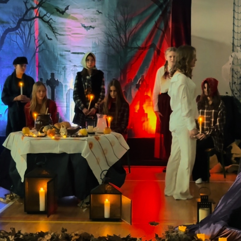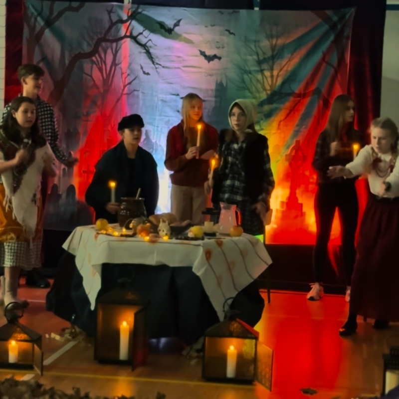Nasza szkoła na chwilę przeniosła się w świat tajemnicy, grozy i dawnych obrzędów. Szkolne koło teatralne wystawiło „Dziady część II” Adama Mickiewicza – dramat, który od pokoleń porusza wyobraźnię i zmusza do refleksji. Spektakl obejrzały klasy 6, 7 i 8, a sala wypełniła się atmosferą nastrojowej ciemności, migotliwego światła świec oraz niepokojących dźwięków, które wprowadzały widzów w rytm staropolskiego misterium.