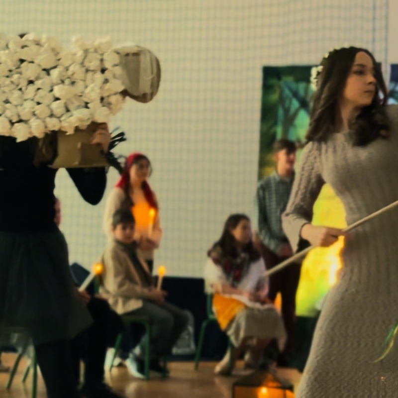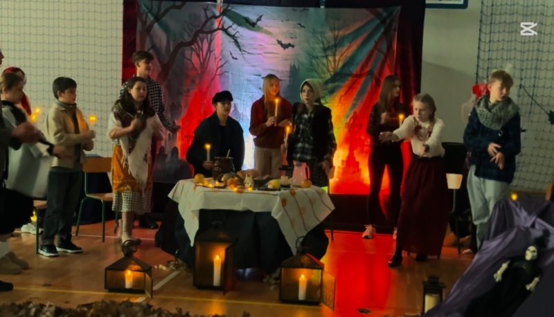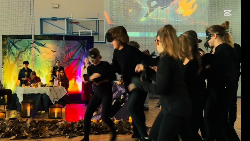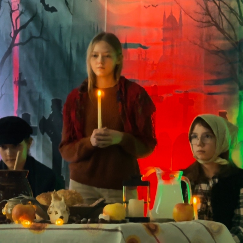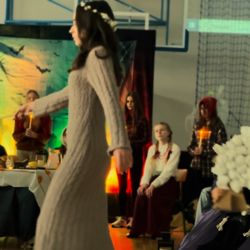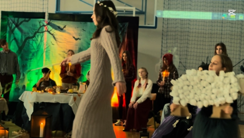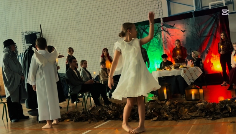 Widzowie z zapartym tchem obserwowali, jak szkolna scena zamienia się w cmentarne miejsce obrzędu, a każdy kolejny epizod odsłaniał kolejną tajemnicę świata zmarłych. Dzięki starannie przygotowanym kostiumom, grze świateł oraz sugestywnej narracji spektakl zyskał wyjątkowo mroczny, przejmujący charakter.