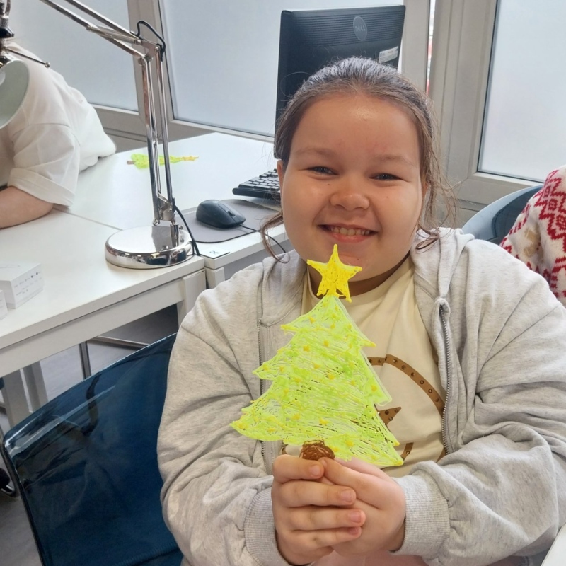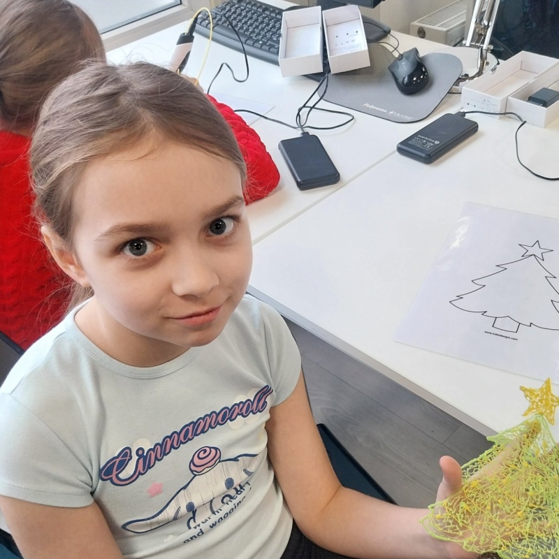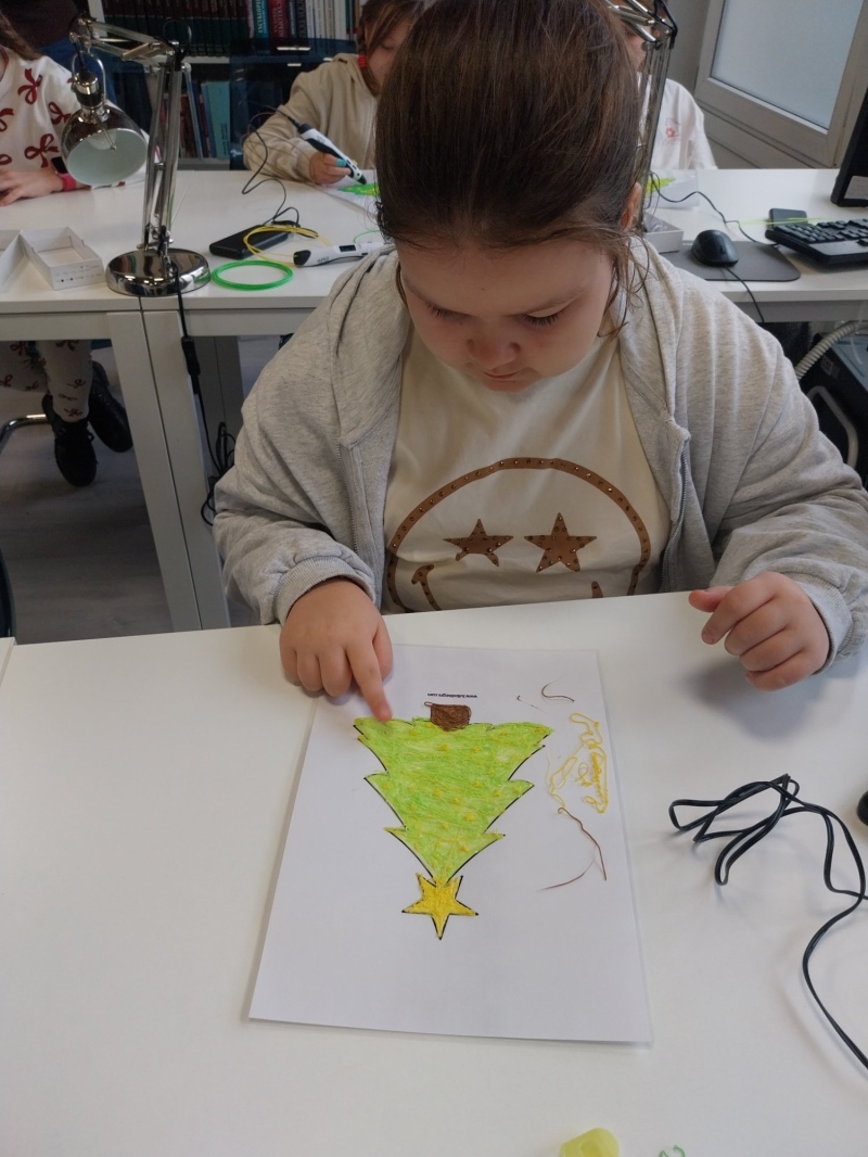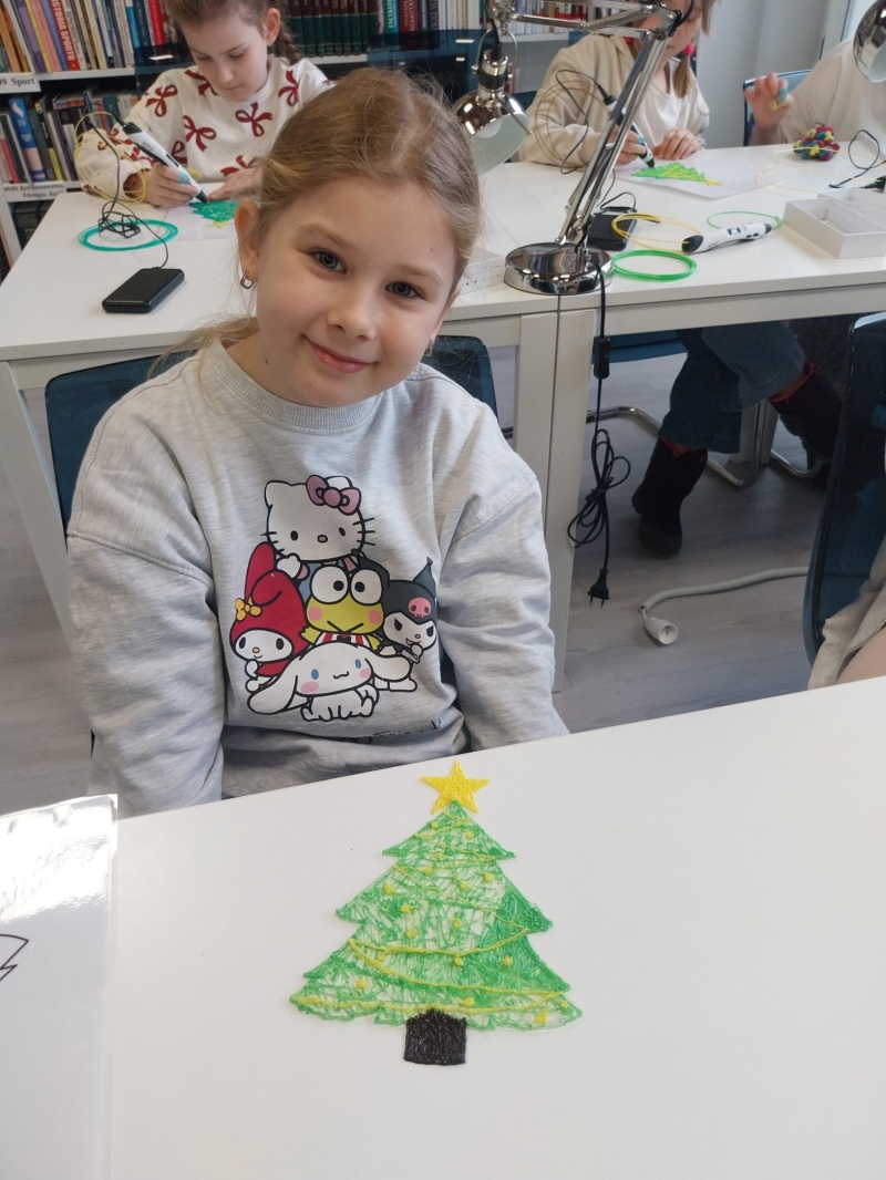 Podczas warsztatów z długopisów 3D, dzieci tworzyły świąteczne choinki na przygotowanych szablonach 🎄✍️