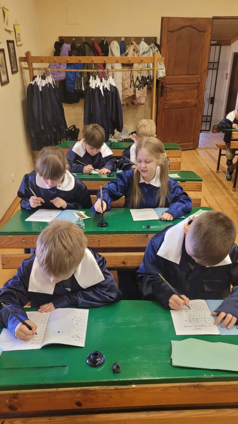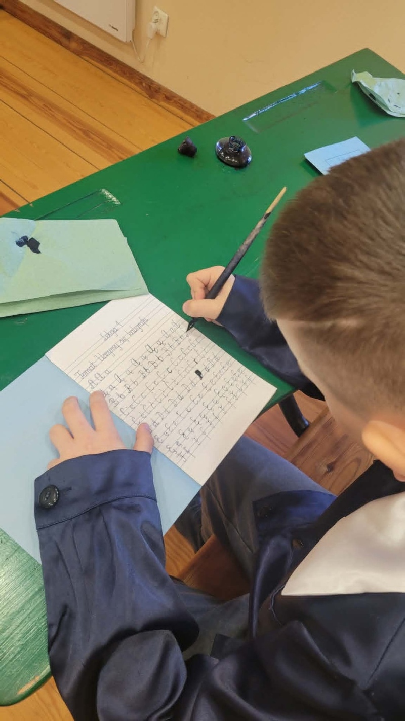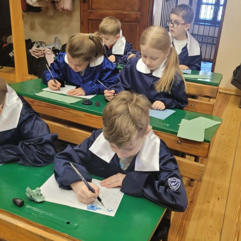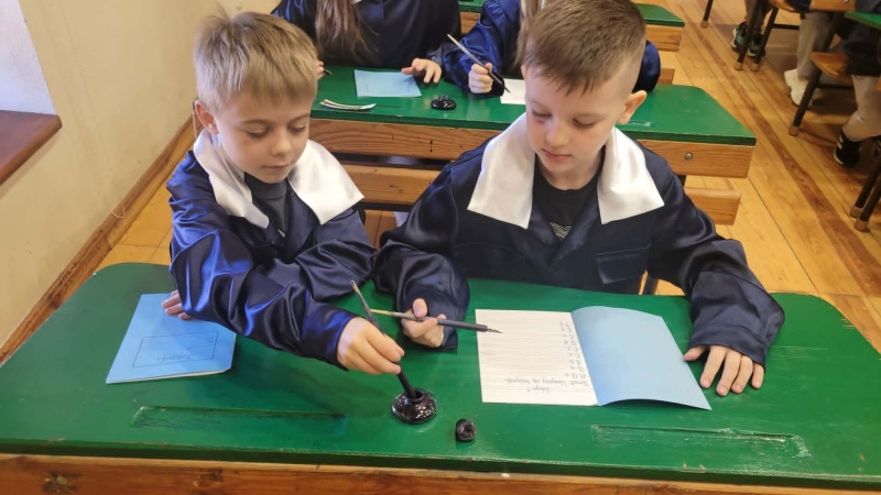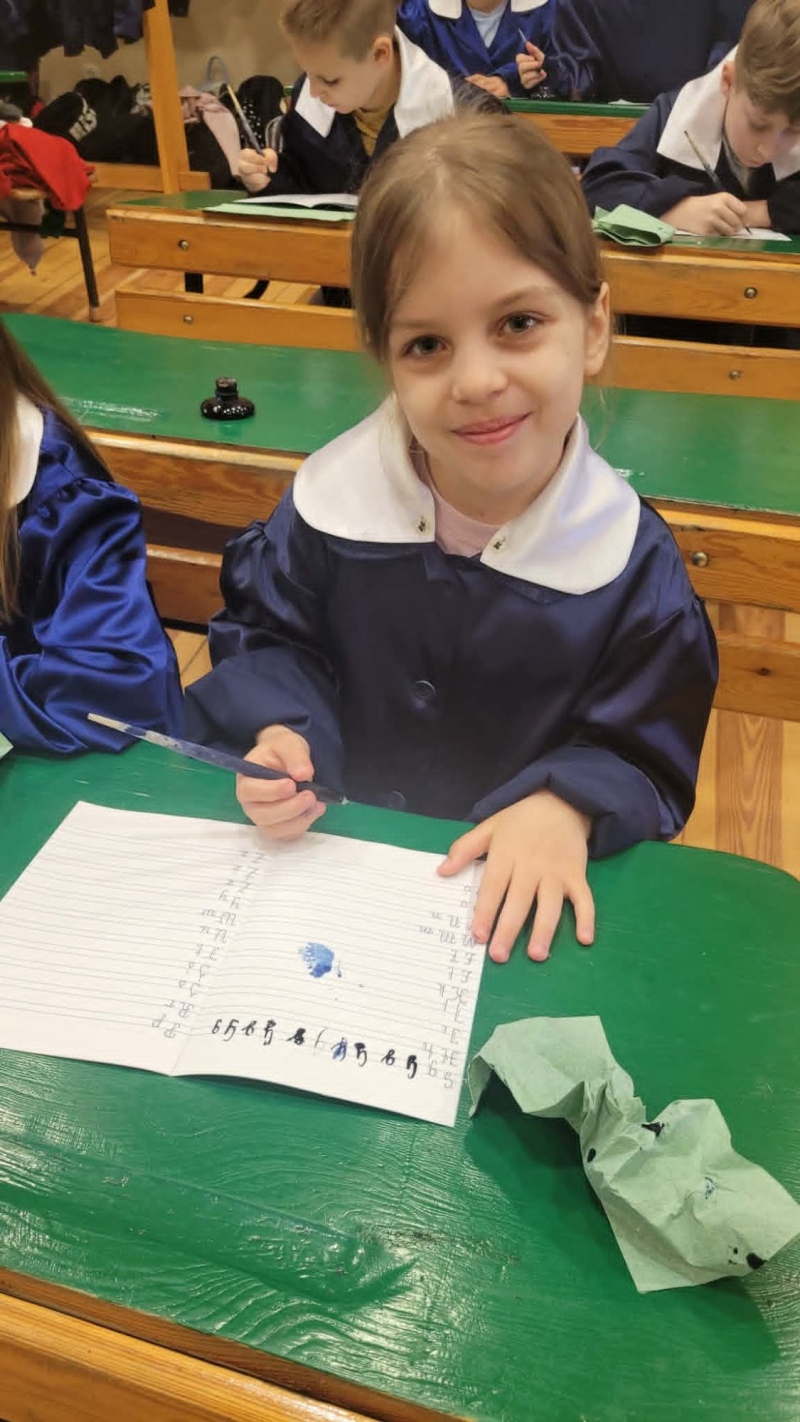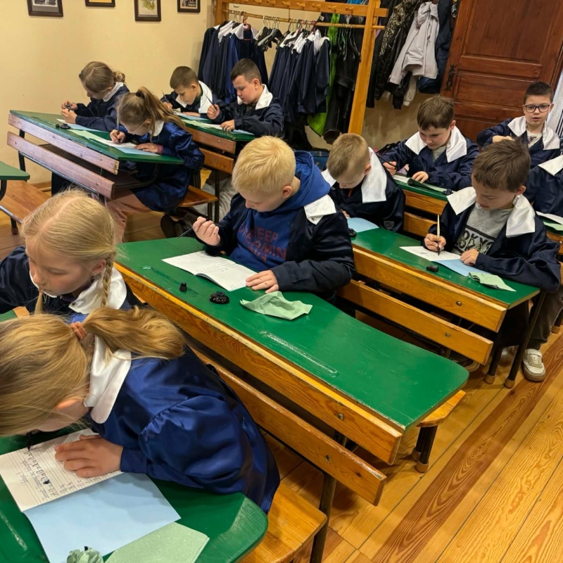 Dużym zainteresowaniem cieszyły się warsztaty kaligraficzne. Uczniowie dowiedzieli się, jak wyglądała nauka w dawnych szkołach, jakie obowiązywały stroje oraz spróbowali pisać piórem. Zadanie to okazało się niełatwe — na kartkach pojawiały się kleksy, a dłonie często były poplamione atramentem.