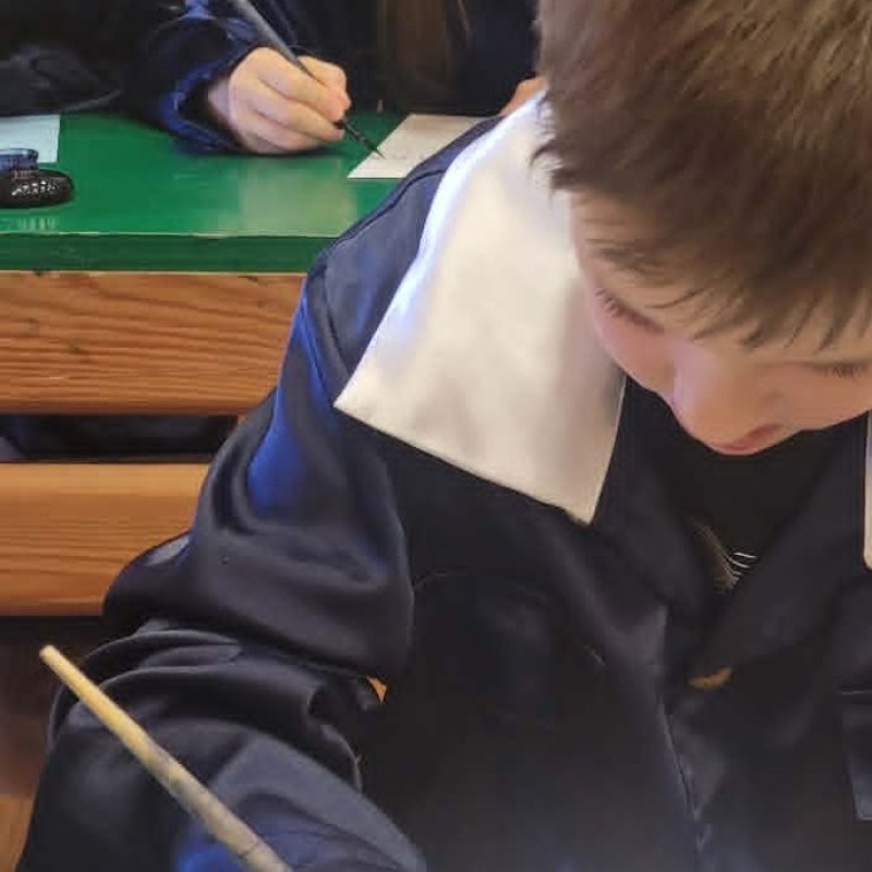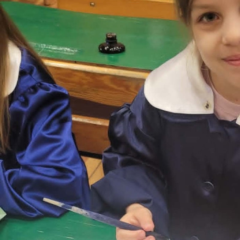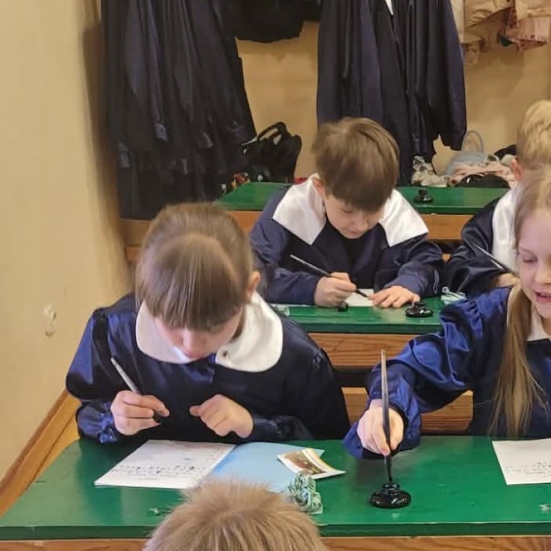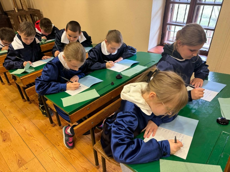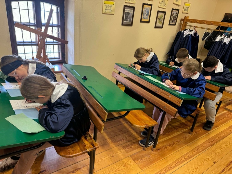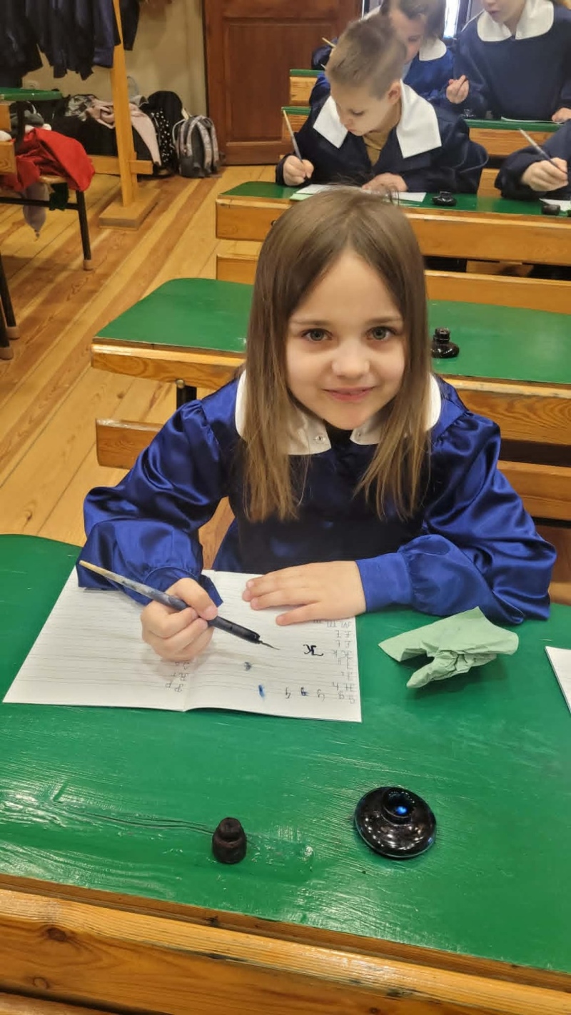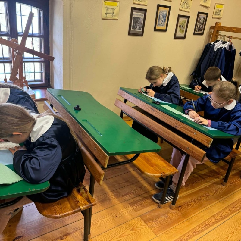 Dużym zainteresowaniem cieszyły się warsztaty kaligraficzne. Uczniowie dowiedzieli się, jak wyglądała nauka w dawnych szkołach, jakie obowiązywały stroje oraz spróbowali pisać piórem. Zadanie to okazało się niełatwe — na kartkach pojawiały się kleksy, a dłonie często były poplamione atramentem.