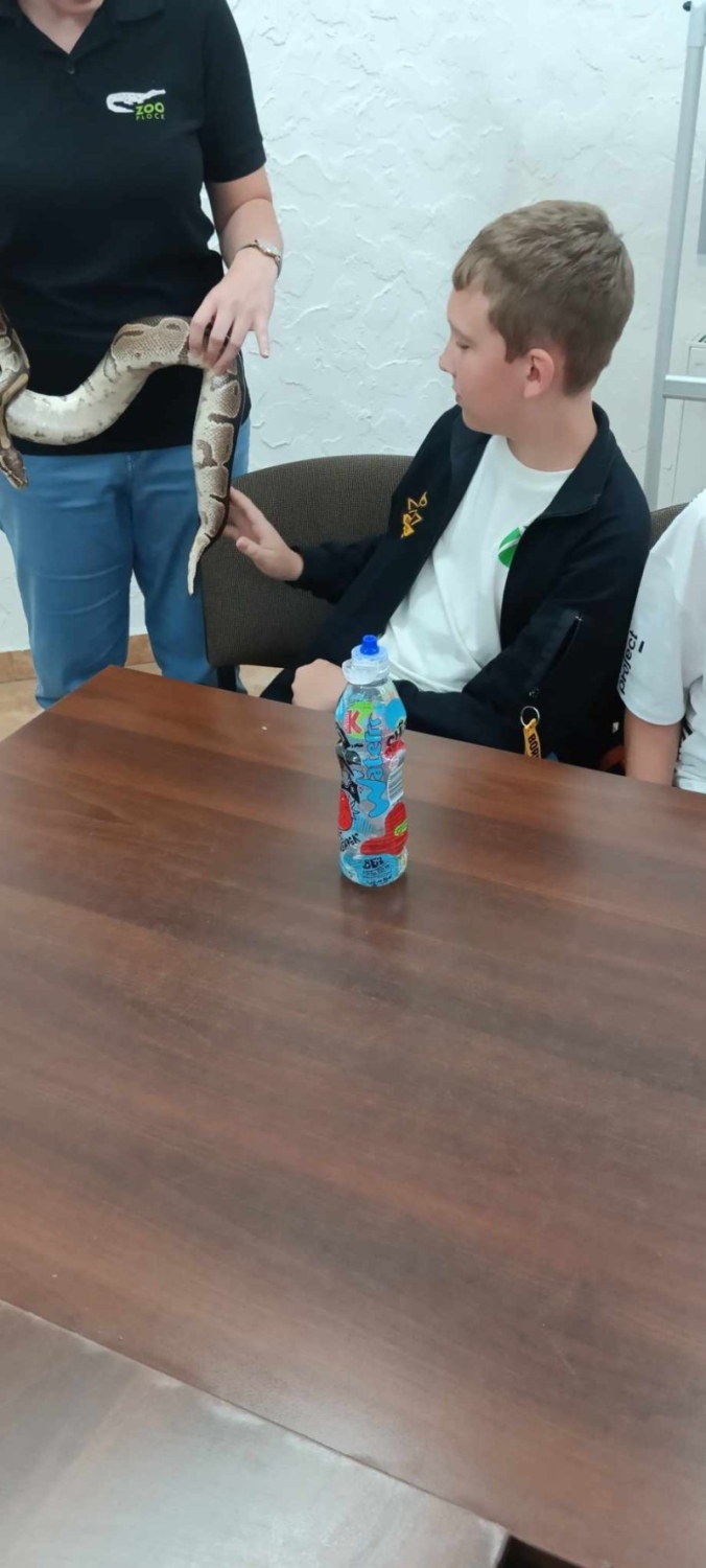 Dnia 11 czerwca klasa 5A udała się na wycieczkę do Ogrodu Zoologicznego w Płocku. Uczniowie podziwiali niezwykłe gatunki zwierząt i roślin tu zgromadzone a następnie udali się na lekcję zatytułowaną „Fascynujący świat zwierząt”, podczas której mieli możliwość nie tylko usłyszeć wiele zdumiewających ciekawostek dotyczących owadów, płazów i gadów, ale również brali na ręce, dotykali i głaskali zwierzęta takie jak wije, karaczany, traszki, straszyki, ślimaki, rzekotki australijskie, agamę brodatą czy żółwie. Najwięcej entuzjazmu wywołało jednak spotkanie z pytonem królewskim o wdzięcznym imieniu Franek. Dzieci chętnie głaskały i trzymały na szyi tego gada. Po tych emocjonujących spacerach zorganizowaliśmy piknik na polu piknikowym, gdzie dzieci zjadły i miały czas na wspólną zabawę.