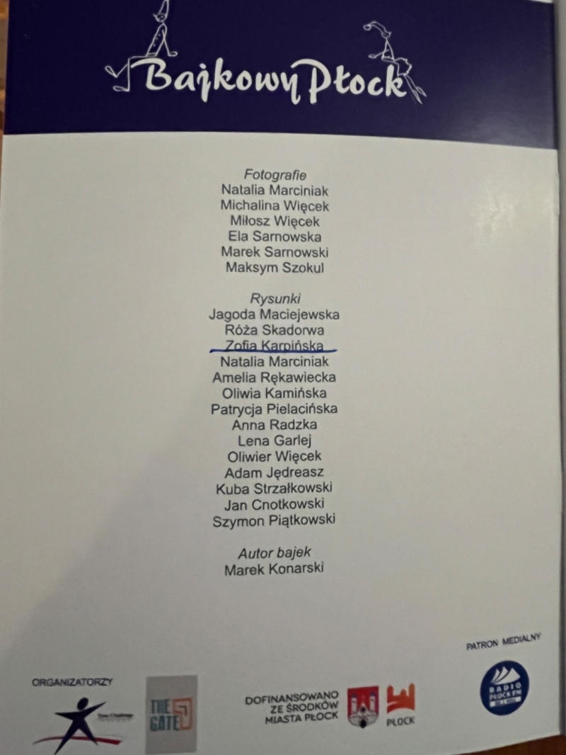 Szczególne gratulacje należą się uczennicy klasy IB Zofii Karpińskiej, której praca została wyróżniona i jej nazwisko znalazło się na pierwszej stronie książki "Bajkowy Płock". To był niezwykle ciekawy projekt. Cieszę się, że mogłam z dziećmi klas 4b i 1b być jego częścią. Wychowawca Ewa Kowalik