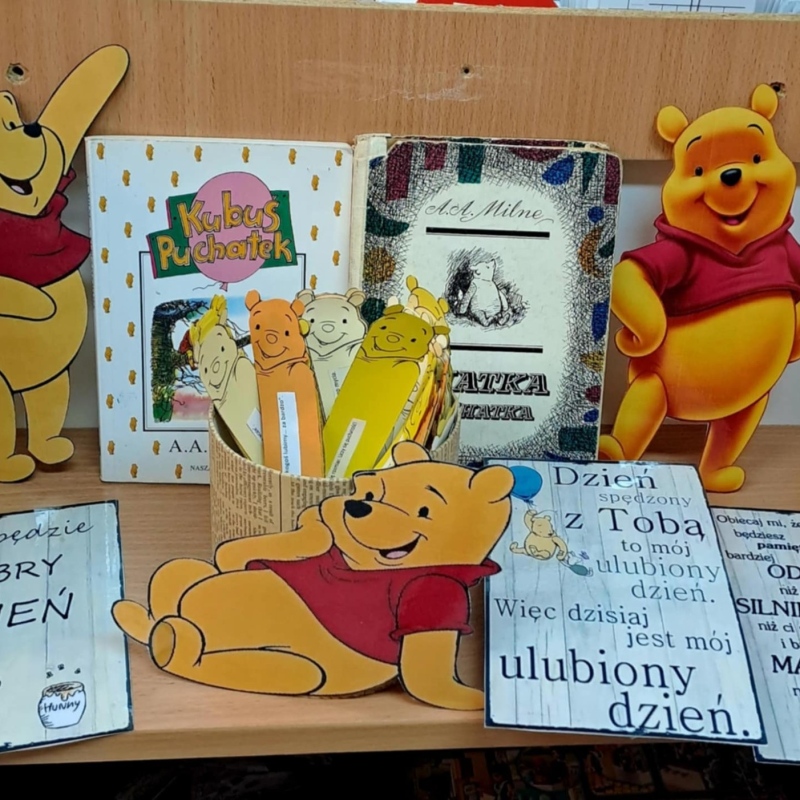 Dnia 17 stycznia 2025 roku w bibliotece szkolnej świętowaliśmy Dzień Kubusia Puchatka 🍯. Każdy mógł poczytać lub obejrzeć zgromadzone na wystawce książeczki. Odwiedzający bibliotekę poznali też piękne życiowe mądrości Kubusia, rozmawiano o przyjaźni i jej znaczeniu w życiu każdego z nas. Dla czytelników przygotowane zostały zakładki i karteczki z „misiową filozofią”. Chętni pozowali do zdjęć z ulubioną maskotką. Dzięki obchodom Dnia Pluszowego Misia klimat piątkowego dnia znacznie się ocieplił. 🧸