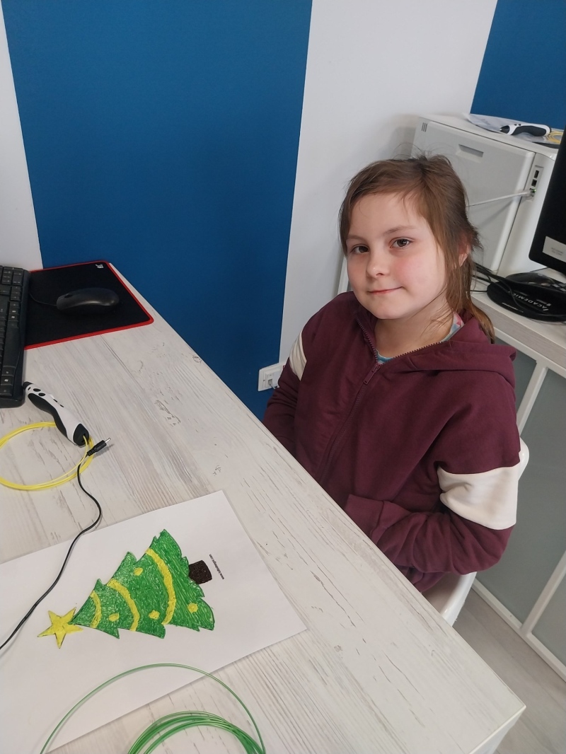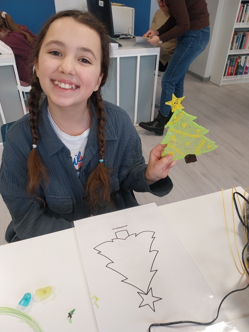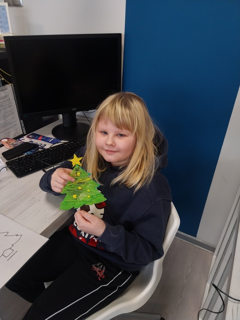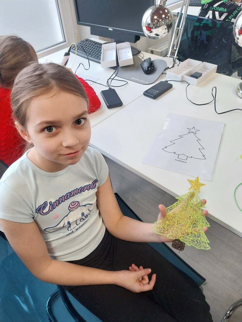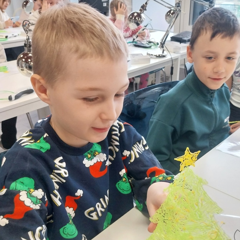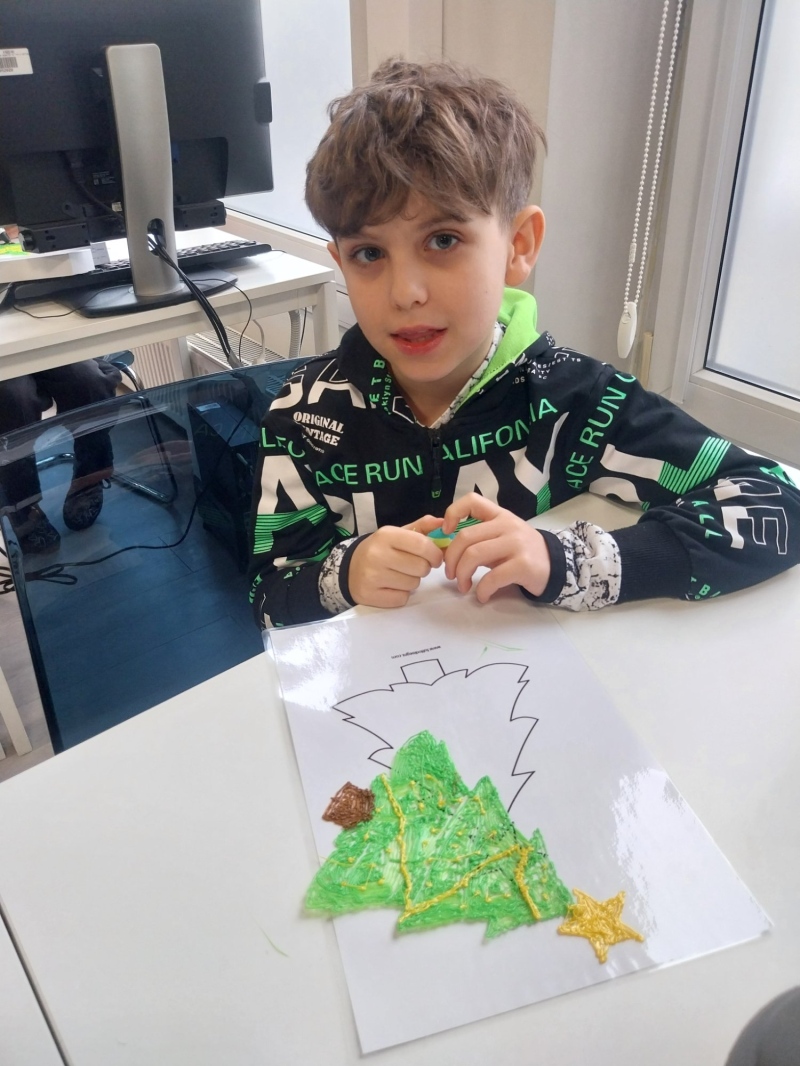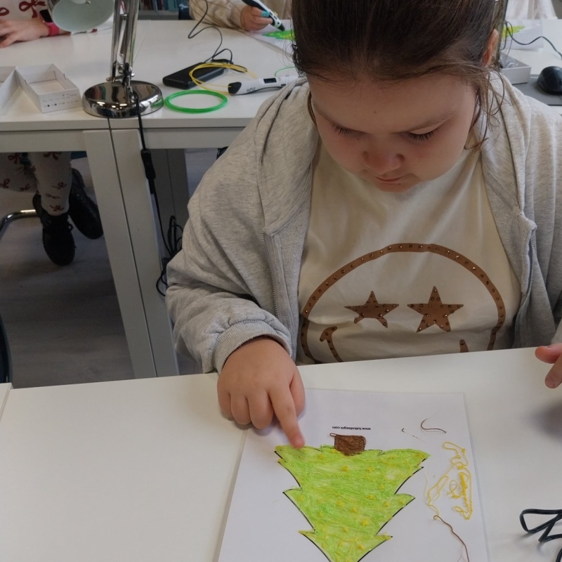 Podczas warsztatów z długopisów 3D, dzieci tworzyły świąteczne choinki na przygotowanych szablonach 🎄✍️