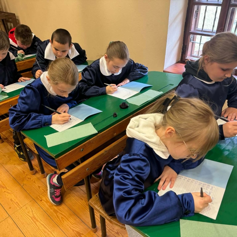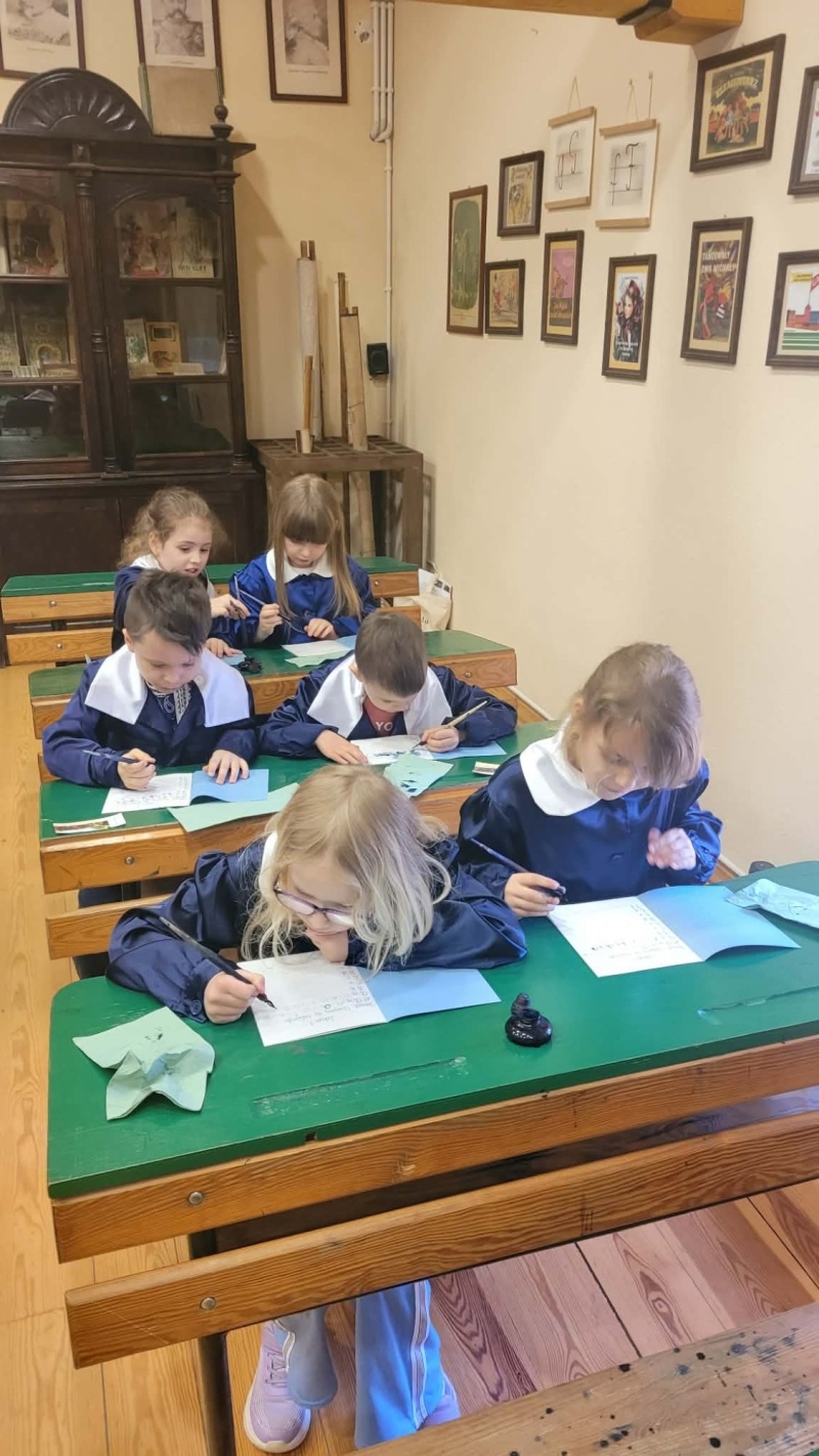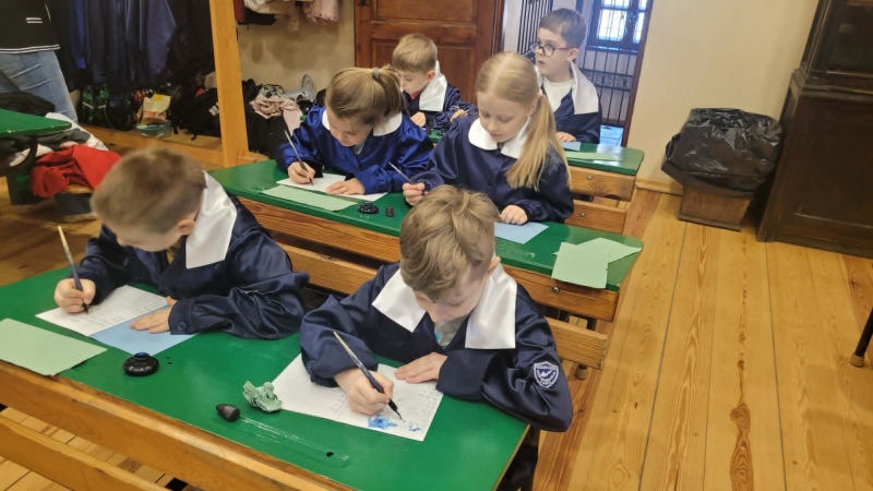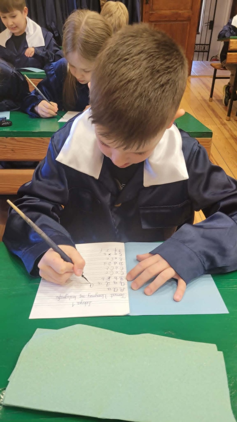 Dużym zainteresowaniem cieszyły się warsztaty kaligraficzne. Uczniowie dowiedzieli się, jak wyglądała nauka w dawnych szkołach, jakie obowiązywały stroje oraz spróbowali pisać piórem. Zadanie to okazało się niełatwe — na kartkach pojawiały się kleksy, a dłonie często były poplamione atramentem.