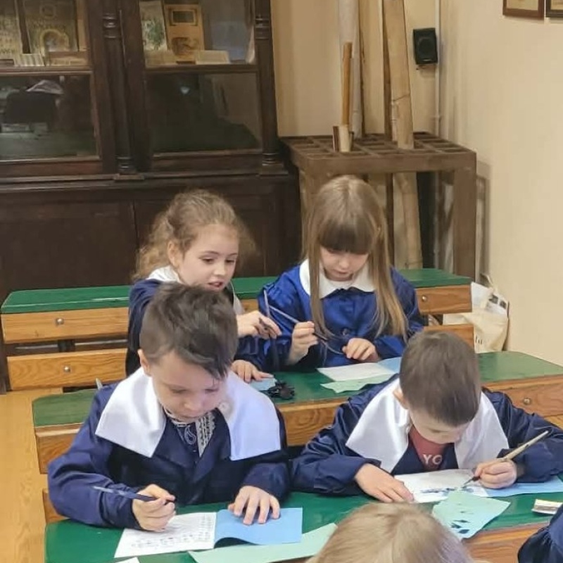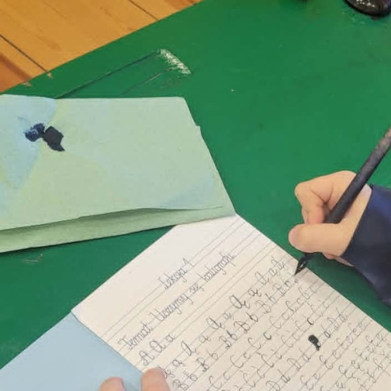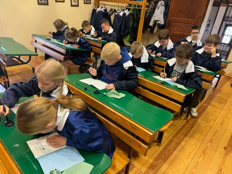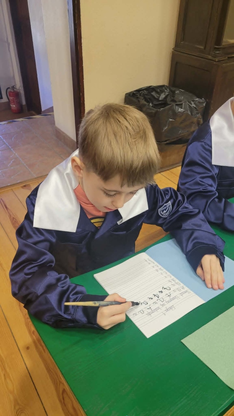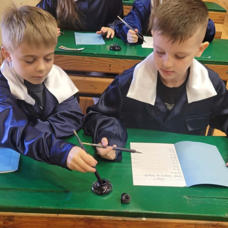 Dużym zainteresowaniem cieszyły się warsztaty kaligraficzne. Uczniowie dowiedzieli się, jak wyglądała nauka w dawnych szkołach, jakie obowiązywały stroje oraz spróbowali pisać piórem. Zadanie to okazało się niełatwe — na kartkach pojawiały się kleksy, a dłonie często były poplamione atramentem.